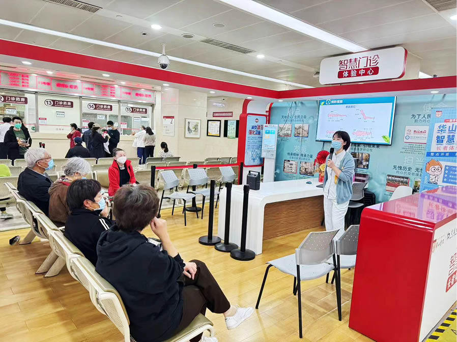 在推進(jìn)新技術(shù)應(yīng)用的同時(shí),華山醫(yī)院考慮到目前還不能熟練使用智能設(shè)備的老年患者,開設(shè)智慧門診長(zhǎng)者中心,教老人學(xué)習(xí)“掌上就醫(yī)”